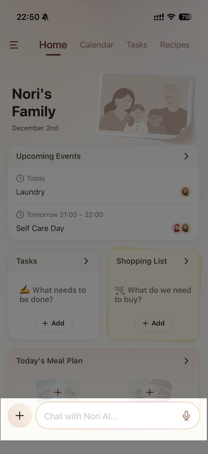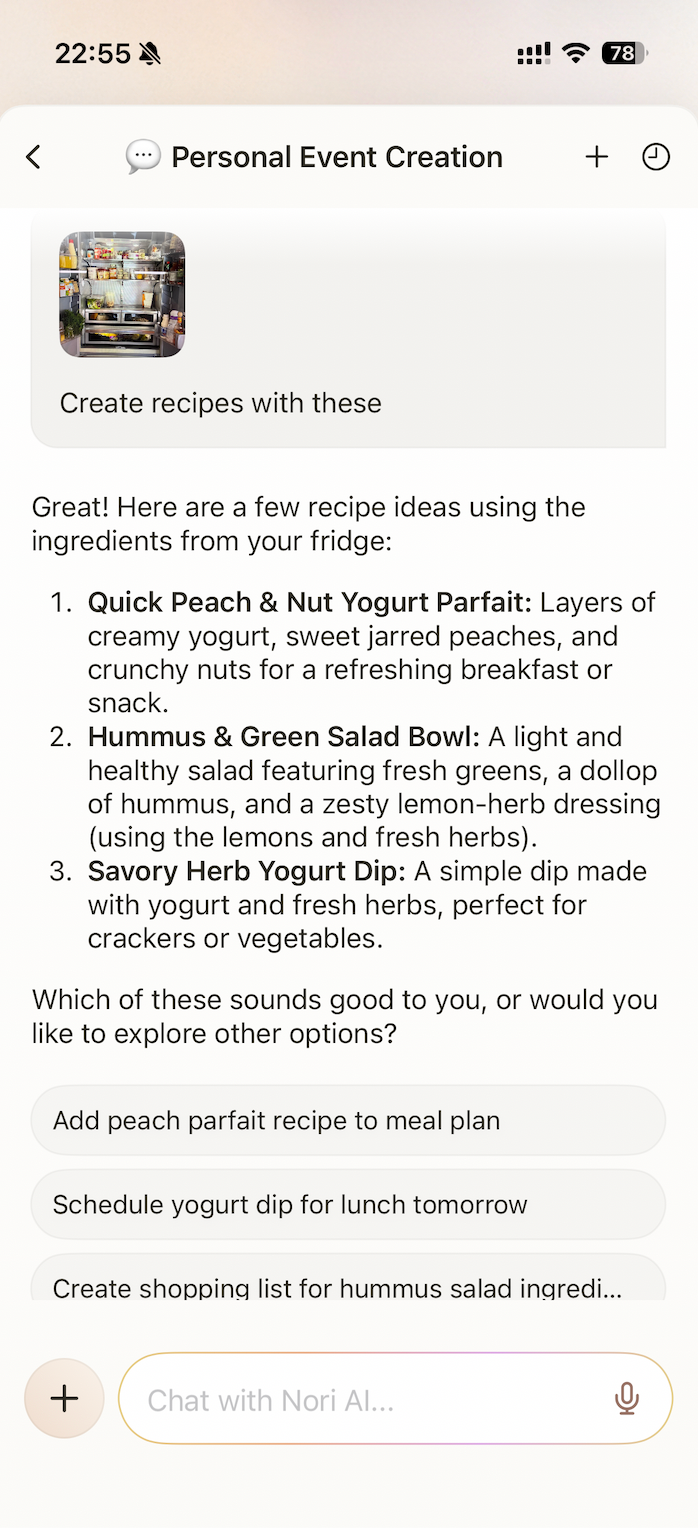 Nori AI Chat is a powerful tool that helps you work hands-free, save time, and turn ideas into actions. You can use it to create events, recipes, lists, notes, and much more. You can talk, type, or upload photos depending on what works best for you.
