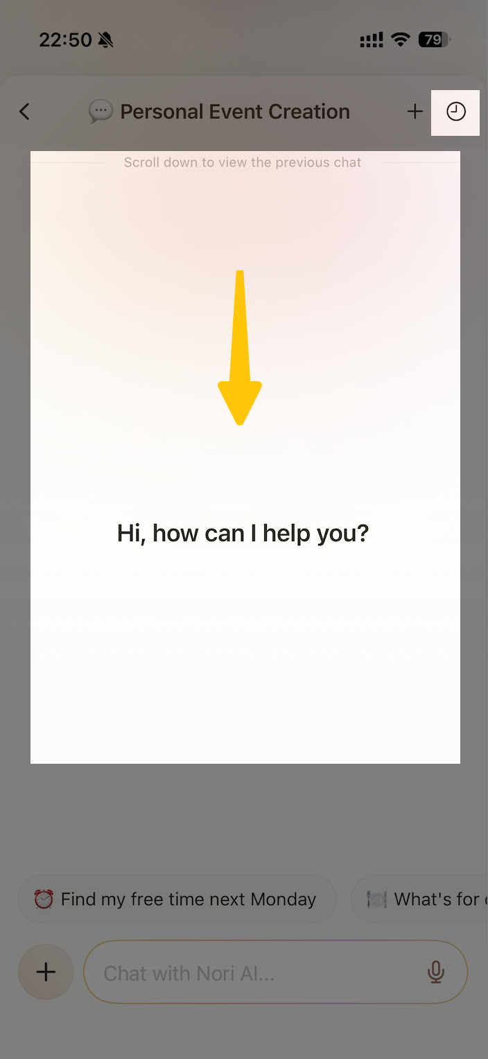 - Scroll down in the black chat area to see your latest messages, or tap the history icon in the top-right corner to browse all past conversations.