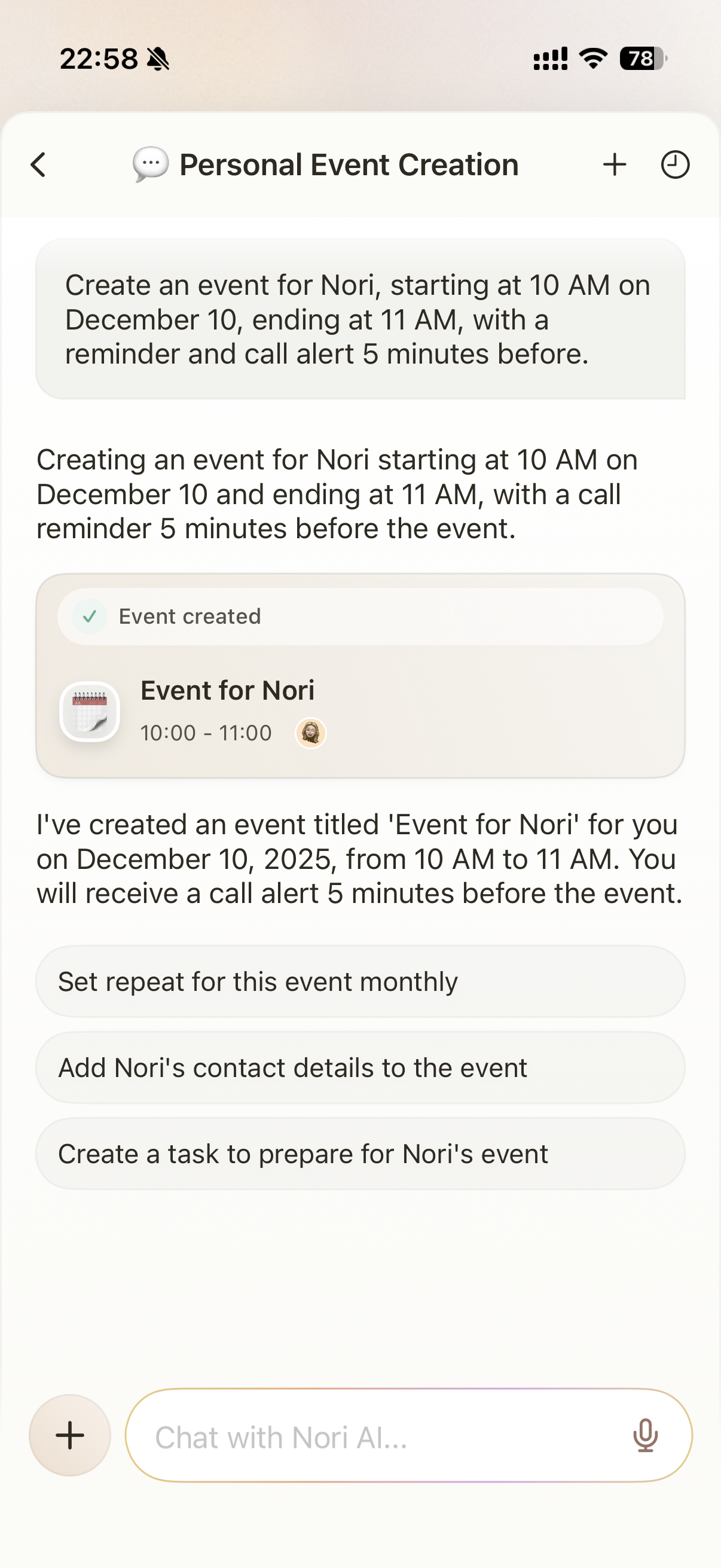 - Use Nori AI Chat to create events in a flexible, conversational way. You can edit the title, time, reminders, members, description, and location directly in AI chat but you cannot add attachments or change visibility inside AI chat.