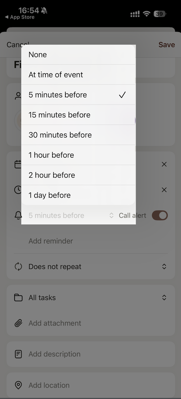 Tasks appear in your Calendar just like events. You can edit the title, date, time, reminder or call alert, repeat settings, location, and attachments in a task.