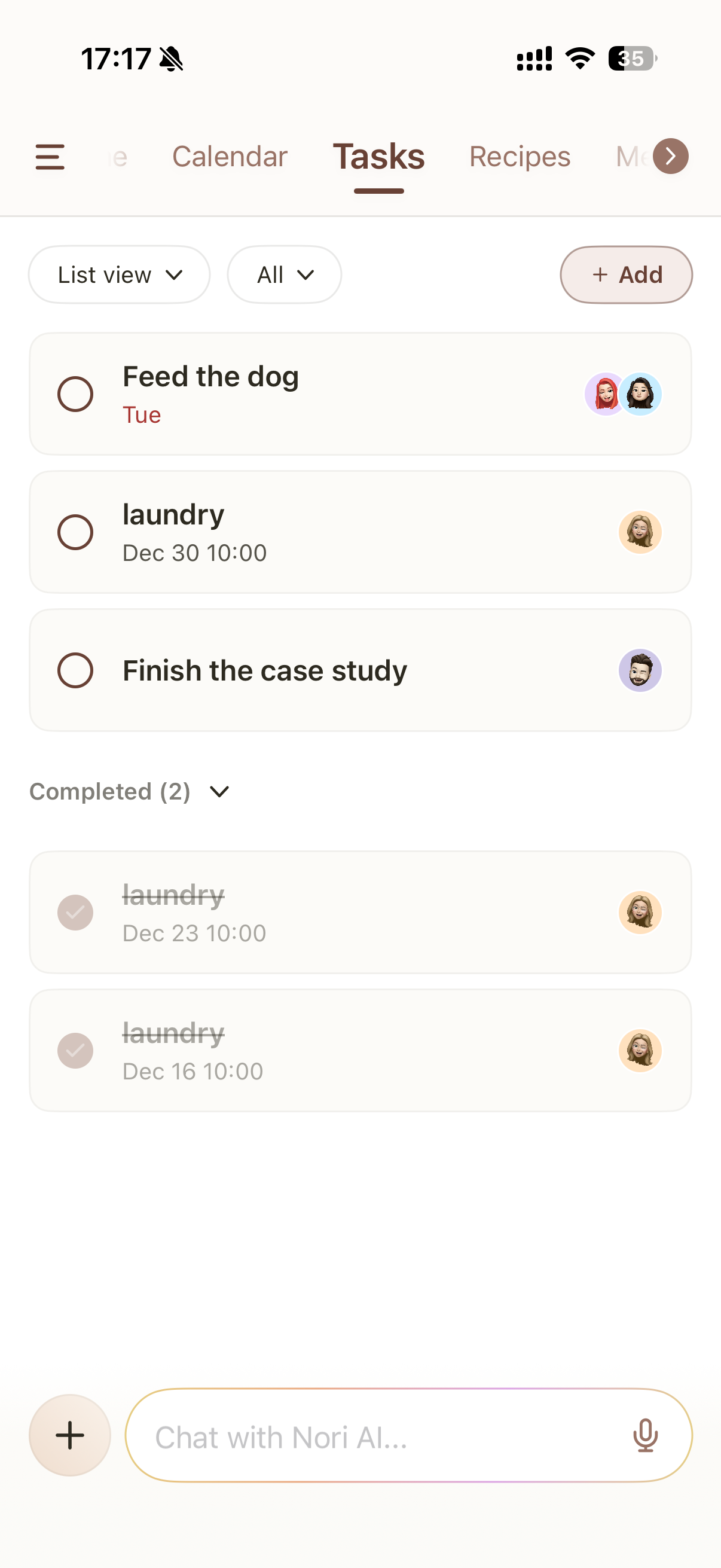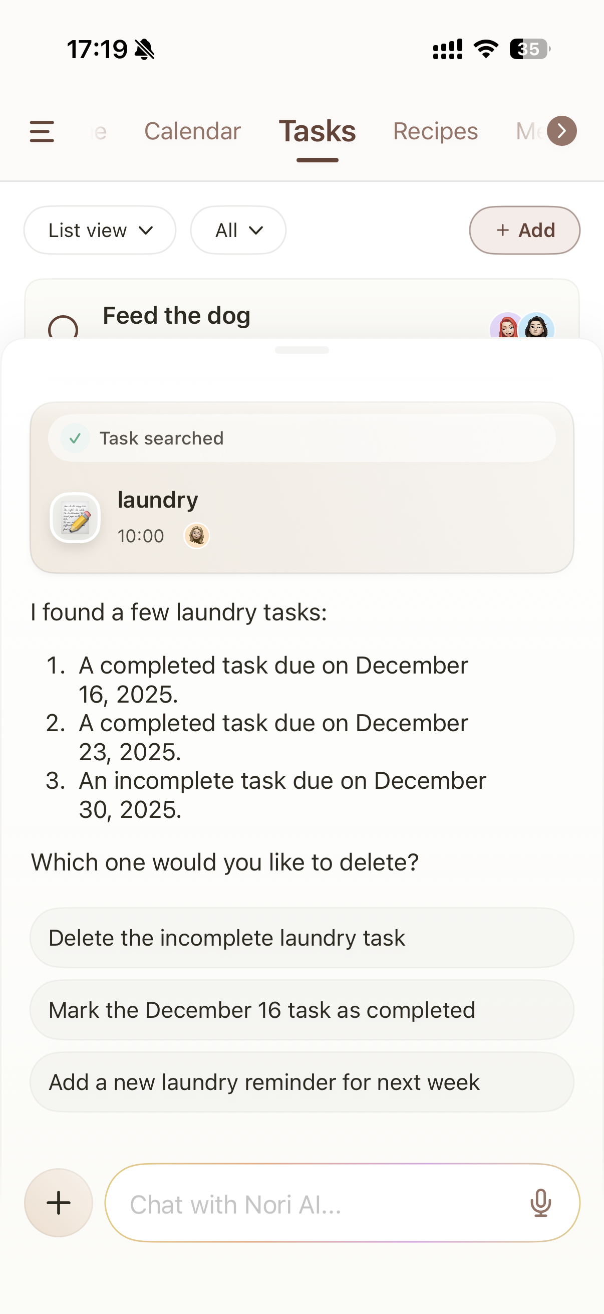 You can also complete or delete tasks through Nori AI Chat.