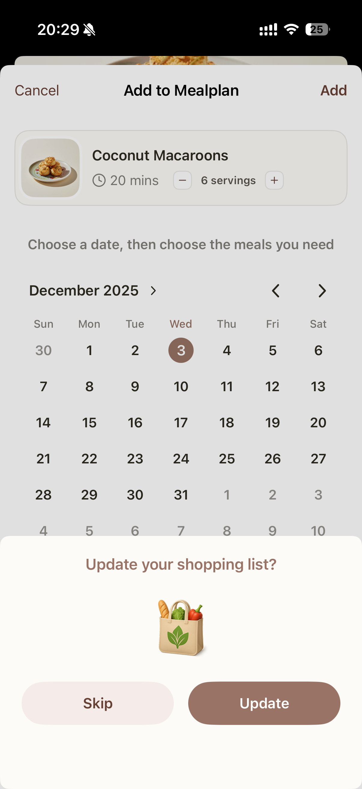Under Meal Plan, when you add a recipe to any meal, you may receive the same prompt asking whether to update your Shopping List.