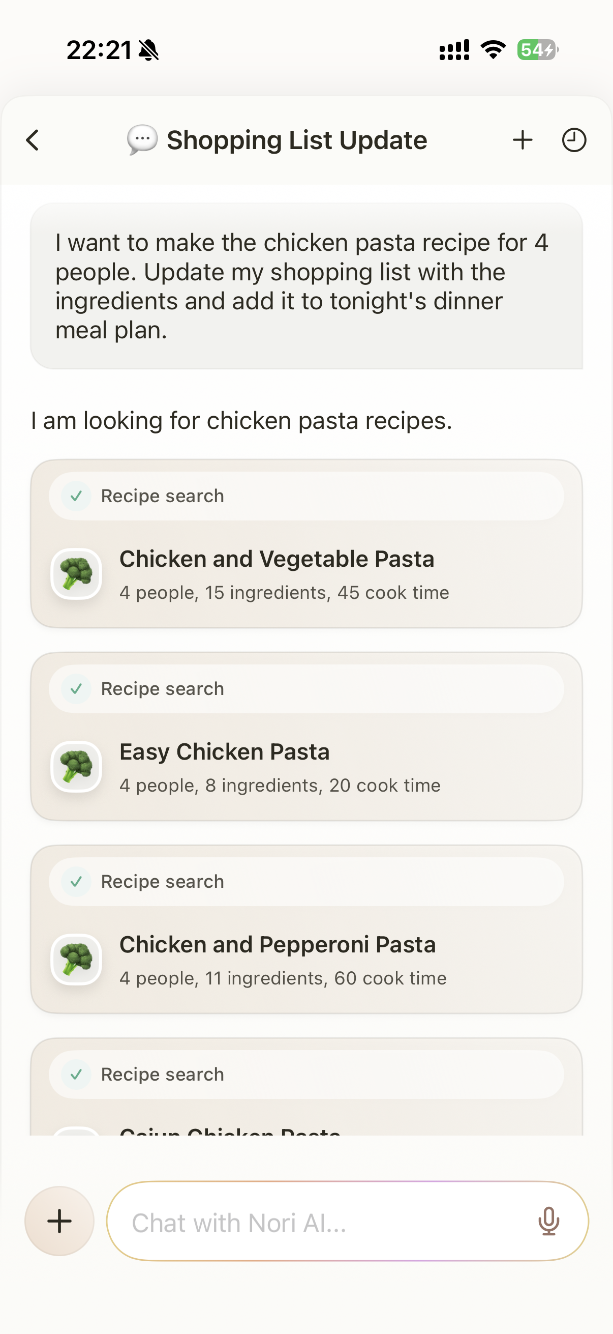 Nori AI will calculate the servings, update your shopping list with the correct ingredients, and insert the meal into your plan.