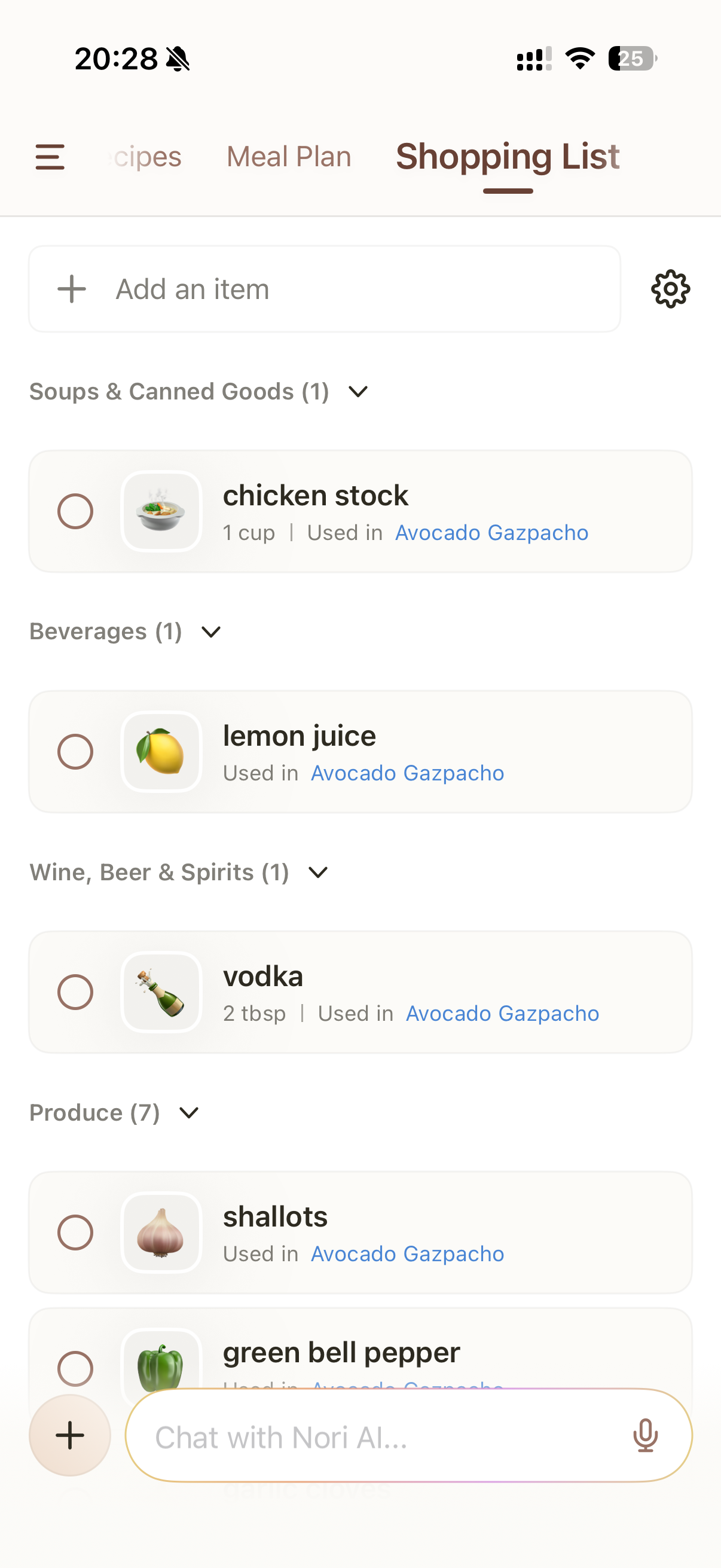 The Shopping List helps you keep track of groceries and avoid missing important ingredients. You can add items manually or let Nori update your list based on your meal plan and recipes.